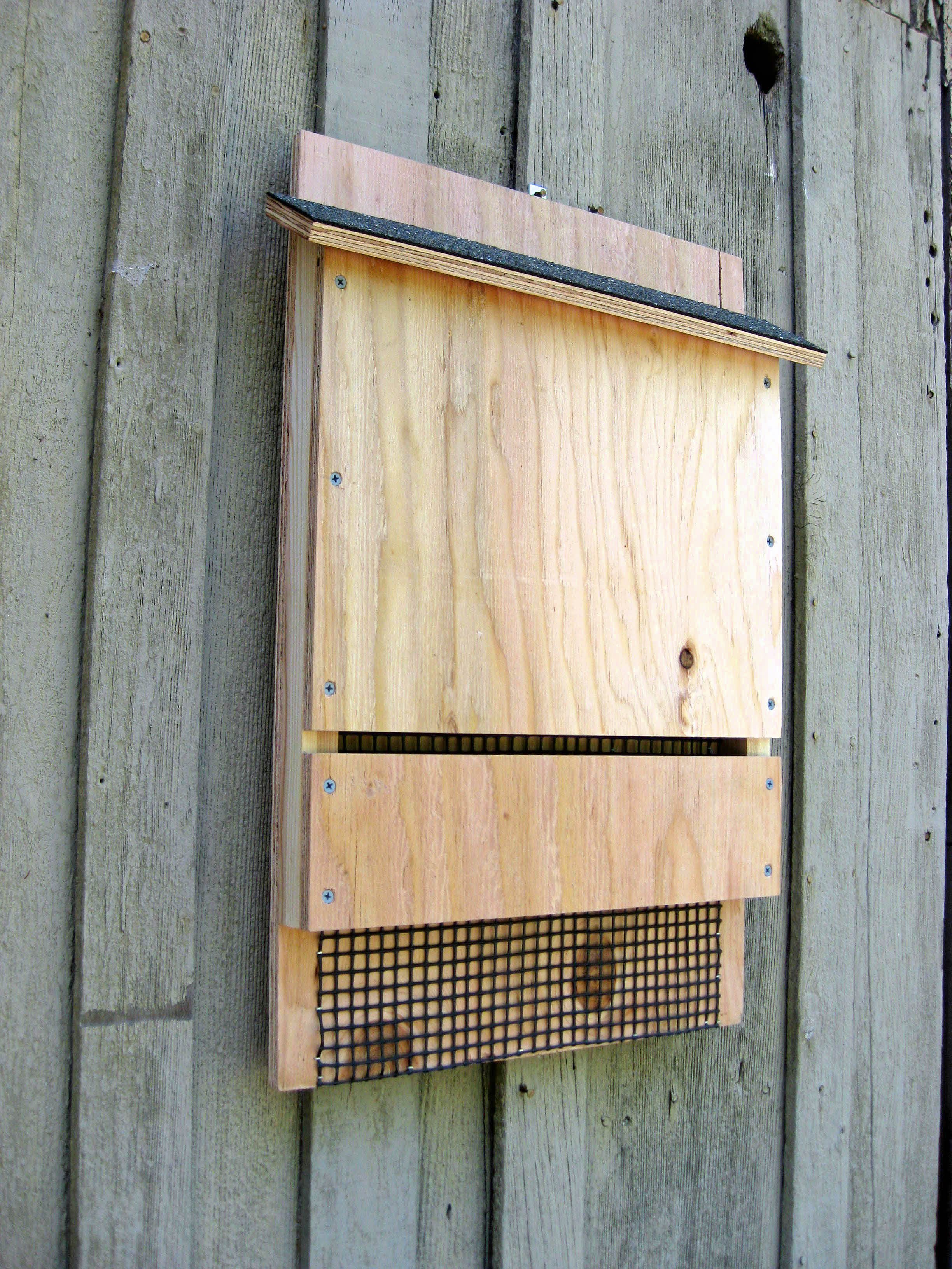 Prototype of a one-chamber Bat House to specifications found in the UC Davis bulletin on Bat Houses, and also suggestions from John Schuster of Wild Wing Co.
